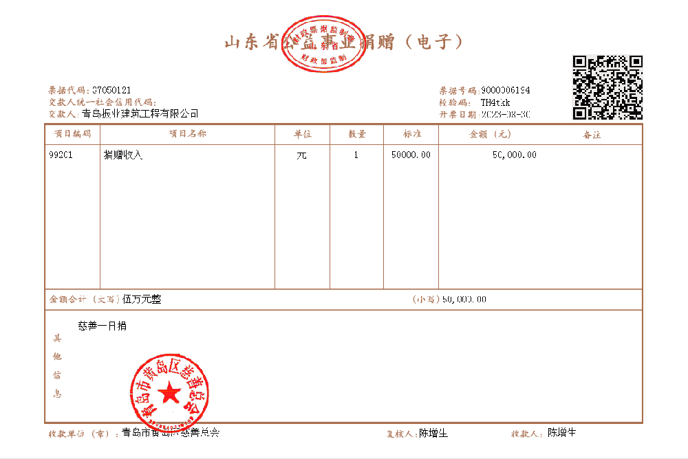 2023年青岛振业建筑工程有限公司向黄岛区慈善总会捐赠5万元整。